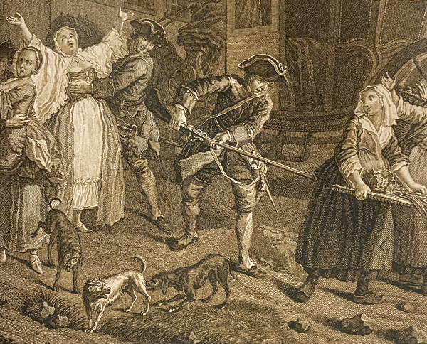 Первое нападение на блюстителей порядка произошло 16 мая 1750 г. в квартале Сент-Антуан: прохожие набросились на приставов, которые силой усаживали в фиакр какого-то мальчугана. Полицейские попытались спастись бегством, но были пойманы и жестоко избиты. Волнение мгновенно распространилось по всему городу. Парижане высыпали на улицы и с криком «Бей похитителей детей!» принялись колотить всякого, кто носил красный мундир или просто походил на полицейского. 22 мая в разных концах Парижа одновременно произошли несколько серьезных инцидентов: бунтовщики закидали камнями дом комиссара Денуайе на улице Клери, чуть не подожгли жилище комиссара Делафосса на улице Каландр и разграбили лавку торговца жареным мясом, который отважился спрятать у себя одного из стражников. На следующий день дело дошло до убийств. 23 мая на паперти церкви Сен-Рок был растерзан пристав Лаббе. В тот же день погиб полицейский агент, некий Паризьен. Он пытался укрыться в бюро комиссара Лаверже, но даже находившиеся там стражники не спасли беднягу от расправы. Завязав веревку на шее убитого, бунтовщики приволокли его тело на улицу Сент-Оноре, под окна особняка генерального лейтенанта Беррье. Всю ночь они осаждали этот дом, угрожая поджечь его, но ограничились лишь тем, что побили в нем стекла. Пешая и конная стража, а также швейцарские и французские гвардейцы, поднятые по тревоге, издали наблюдали за происходящим: они получили приказ не применять оружие, и на их глазах в течение трех дней семь или восемь полицейских были убиты, десятки – ранены и избиты. Затем волна насилия спала сама по себе также быстро, как и поднялась.