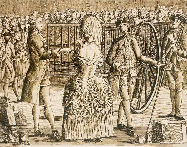 Мария Луиза Николе, вдова Дерю, приговоренная к сечению плетьми и клеймению по обоим плечам буквой V (voleuse, т. е. воровка), а затем – к вечному заключению в Сальпетриер, перед воротами Консьержери в Париже 13 марта 1779 г. Эстамп. XVIII в.