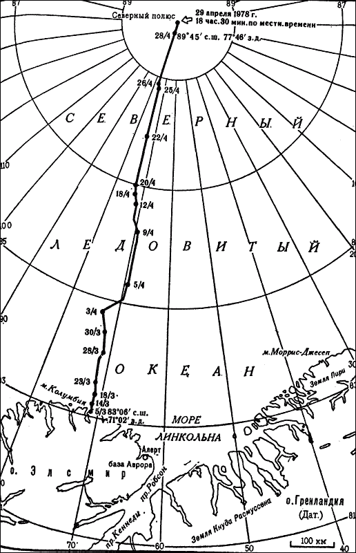 4. Скорость дрейфа льда зависит, как отмечалось в предисловии, от скорости ветра и скорости постоянных океанических течений. Замечание Уэмуры, по-видимому, основано на недоразумении: течения и дрейф льдов вблизи полюса, не отличаются какими-либо особенностями.