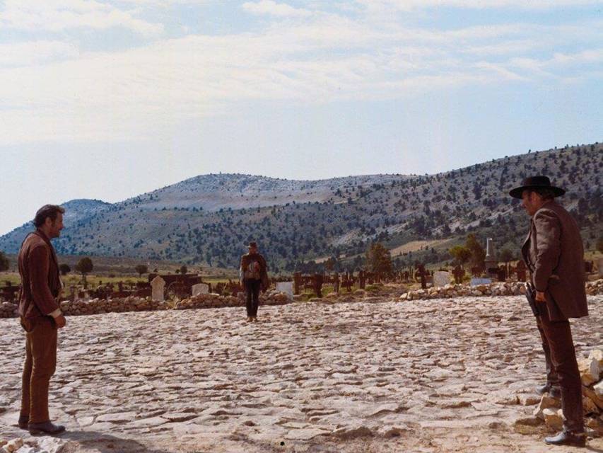1 – Мексиканское противостояние – это кинематографический троп, описывающий ситуацию, когда несколько сторон находятся в конфронтации, угрожая друг другу оружием, и ни одна из них не может предпринять решительных действий, не подвергая себя риску быть атакованной другими участниками. Классическим примером является сцена из фильма «Хороший, плохой, злой», когда эти трое, Хороший, Плохой и Злой, становятся на бесплодной пашне, покрытой трещинами, и начинают тройную дуэль. Серджио Леоне знал, что делает, поэтому сцена получилась очень атмосферной.