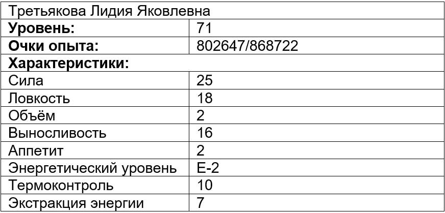 Она вложилась в «Энергетический уровень», доведя его до Е-2, но пожопилась на Е-3, потому что предпочла вложить очки в «Силу» и «Ловкость».