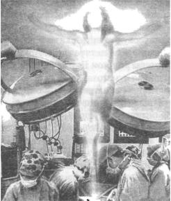 Иногда невидимые обычным зрением тонкие тела человека – эфирное и астральное – могут быть запечатлены на фотоснимках. Призрак в операционной на снимке вверху – это выделившееся в пространство эфирное или астральное тело женщины, скончавшейся во время операции на сердце. Фантом был совершенно случайно запечатлен на видеокамеру в одной из частных клиник Германии (в Европе давно уже принято снимать операции на видео для последующего анализа действий хирургов).