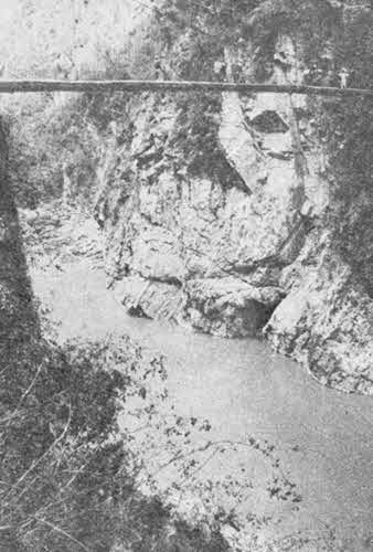 …Наконец спуск кончился. Последний участок его был настолько крут, что люди вырубили на тропе ступеньки. Внизу змеилась река Моди. Через нее перекинут узкий висячий мост. Дул ветер. Мост раскачивался у нас под ногами. Внезапный ветер сорвал с рюкзака Дэниэла полотенце (тот вздумал его таким образом просушить). Оно некоторое время еще кружилось в воздухе и, наконец, медленно опустилось на воду. Мы видели, как река подхватила его, завертела и быстро умчала.