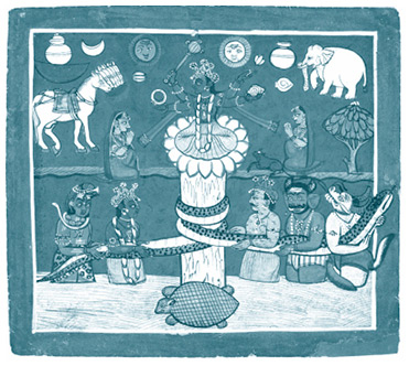 Среди важнейших мифов индуистской мифологии есть история о пахтанье Молочного океана, Самудра-мантхан, которая описывает, как боги и демоны-асуры добывали напиток бессмертия – амриту. Для этого Вишну, приняв образ черепахи, поместил себе на спину гору Мандару, а в качестве веревки участники использовали одного из великих змеев-нагов, Васуки. Таким замысловатым образом они вращали гору в океане, как мутовку, взбивая его воды, пока из этих самых вод не начали появляться чудесные сущности и вещи: прекрасные полубогини апсары, царь всех лошадей Уччайхшравас, корова изобилия Сурабхи, волшебные деревья Париджата и Калпаврикша, лук Кришны Шарнга и богиня вина Варуни… Последним возник Дханвантари, бог медицины, который и нес амриту. Кроме божественного нектара, участники пахтанья ненароком сотворили яд калакуту, способный уничтожить вселенную, но его выпил Шива и тем самым не допустил катастрофы (поэтому, кстати говоря, у Шивы синяя шея). Молочный океан, как отмечает исследователь мифов Девдатт Паттанаик, олицетворяет бесконечные возможности мира и материю, которая находилась во власти энтропии, пока боги и демоны не начали ее ворошить.