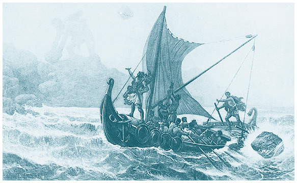 Далее корабли Одиссея попали на остров циклопа Полифема. Сам герой повел отряд в пещеру, где им было суждено столкнуться с хозяином острова, который завалил единственный выход огромным камнем. Потеряв нескольких моряков, Одиссей придумал напоить циклопа, после чего общими усилиями ему выкололи единственный глаз. В гневе циклоп бросал вслед беглецам камни, но не попал в корабль; в конце концов он обратился к своему отцу, владыке морей Посейдону, моля о том, чтобы обидчик вернулся в свой родной дом один, поздно, на чужом корабле и «встретил там горе». Почти все, о чем он просил, сбылось.
