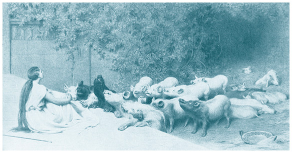 В стране людоедов-лестригонов герой потерял одиннадцать кораблей из двенадцати и вынужден был вновь спасаться бегством. На последнем корабле Одиссей и выжившие спутники достигли острова Эя, где жила дева Цирцея, дочь бога солнца Гелиоса. Волшебница превратила спутников Одиссея в свиней, но сам он – благодаря божественной помощи – сумел одержать над ней верх, и она вернула им человеческий облик.
