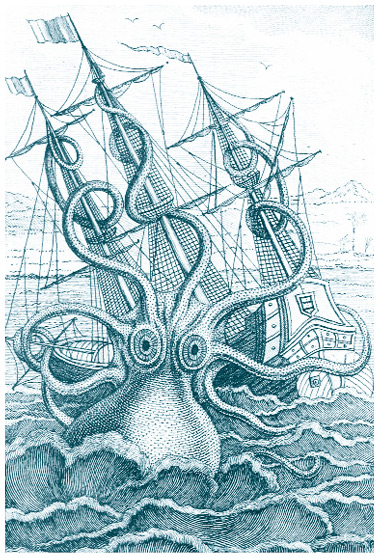 Но как же вышло, что описанная Понтоппиданом офиура-переросток, охочая до рыбы, стала известным нам существом, громадным осьминогом или кальмаром, грозой морей? За это стоит поблагодарить французского натуралиста и малаколога (специалиста по беспозвоночным) Пьера Дени де Монфора. Именно он в энциклопедии по естественной истории начала XIX века описал кракена как колоссального спрута и упомянул о его склонности губить корабли. Благодаря вниманию публики миф обрел второе дыхание.