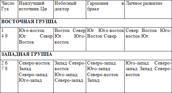 Ваше число Гуа—9. Вы принадлежите к восточной группе. Ваша стихия – Огонь. Ваше лучшее направление (наилучший источник Ци) – восток, Небесный доктор – юго-восток, Романтическая удача (гармония в браке) – север, Личное развитие – юг.