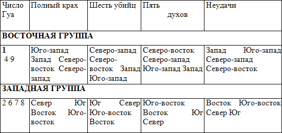 Ваше число Гуа– 1. Худшее для вас направление (полный крах) – юго-запад. Шесть убийц – северо-запад, Пять духов – северо-восток, Неудачи – запад.