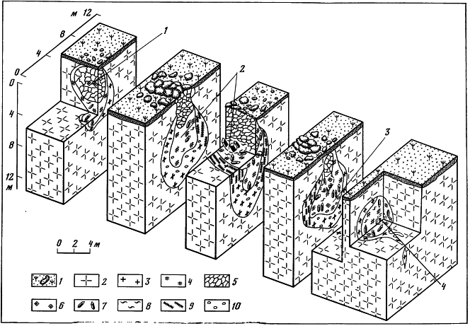 1 – почвенный слой; 2 – крупнозернистый гранит; 3 – аплитовый гранит; 4 – пегматоидная зона; 5 – кварцевое ядро; 6 – кристаллы флюорита; 7 – кристаллы кварца; 8 – гнездовая глинка; 9 – трещины с флюоритом и кварцем; 10 – участки грейзенизации и альбитизации; 1—4 – гнезда-полости с кристаллами свободного роста