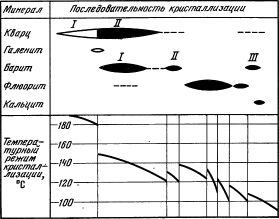 По данным минералогенетических реконструкций (рис. 13) [Ермаков, 1944], месторождение формировалось в интервале температур 90—200° С, наиболее обычные температуры кристаллизации оптического флюорита около 120° С (интервал 100—140° С). Барит более высокотемпературный – 140° С (интервал 120—195° С), кальцит относительно низкотемпературный – 100° С (интервал 90-110° С).