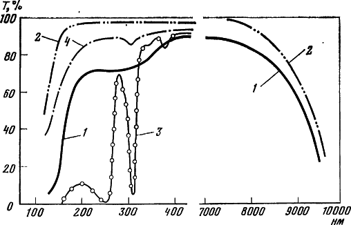 Рис. 21. Спектры пропускания природного флюорита (1) и выращенных из него искусственных кристаллов (2—4) в ИК-области