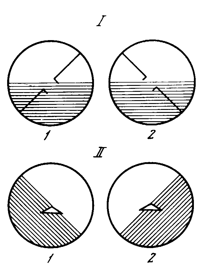 I – 1 – вид индикации "с земли на самолет": 1 — левый крен. 2 – правый крен; II – вид индикации «с самолета на землю»: 1 – левый крен, 2 – правый крен