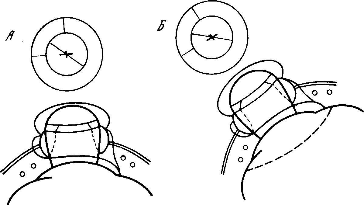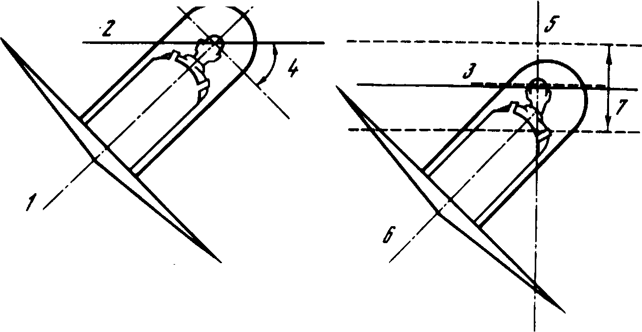 а — летчик держит голову прямо по отношению к вертикальной оси самолета, и горизонт кажется ему наклонным; б — летчик вынужден поворачивать голову, чтобы горизонт остался фиксированным. 1 – ось, проходящая через голову и тело параллельно вертикальной оси самолета; 2 – реальный горизонт; 3 – плоскость, проходящая через глаза, 4 – угол между линией горизонта и плоскостью глаз; 5 – ось, проходящая через голову; 6 – ось, проходящая через тело; 7 – вертикальное перемещение горизонта (по 167)