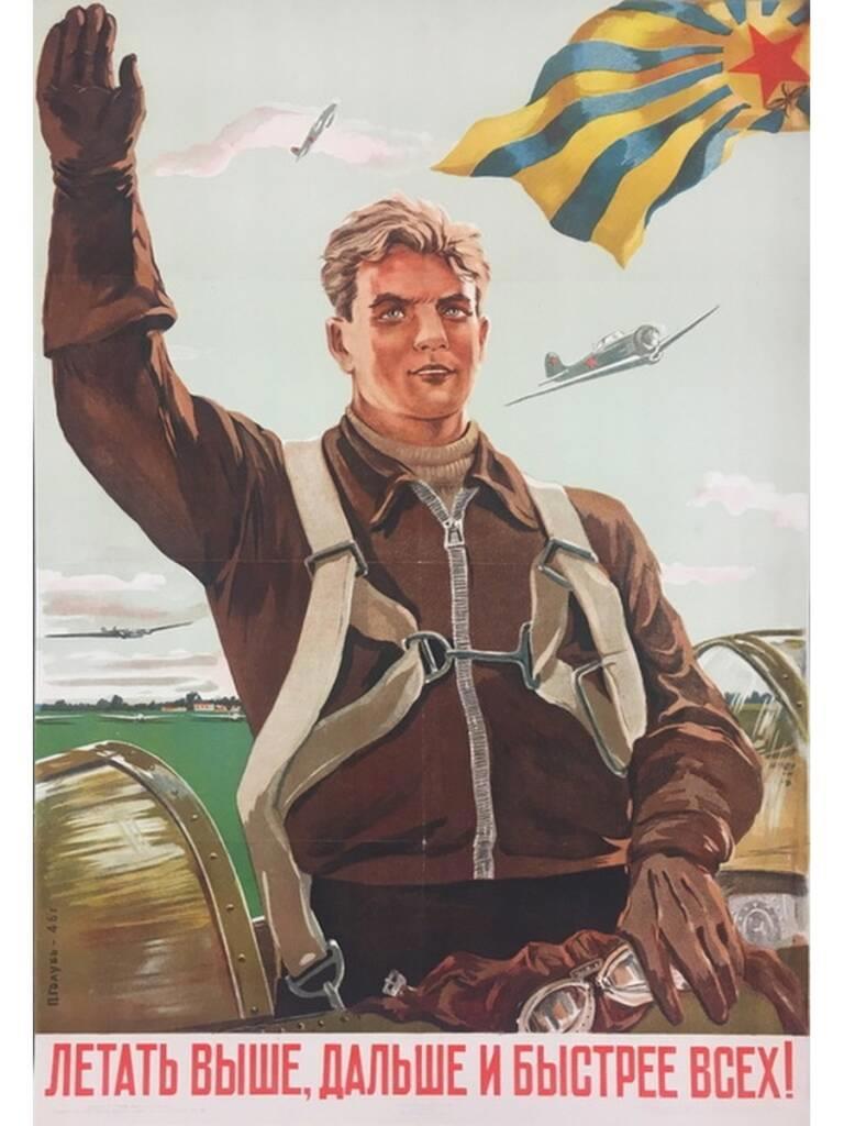 На плакате бодрый молодой мужчина призывал всех летать дальше, выше и быстрее всех в рядах Осоавиахима, а точнее – Общества содействия обороне, авиационному и химическому строительству, предшественнику знакомого нам ДОСААФа (Всесоюзного добровольного общества содействия армии, авиации и флоту СССР).