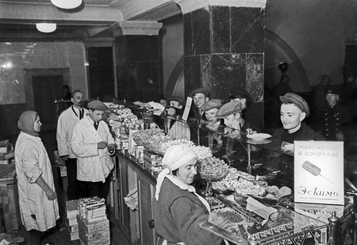 Люди с удовольствием покупали в буфете поштучно, поскольку они были дорогими в то время, шоколадные конфеты «Мишка», «Стратостат» с ликером, "Красная шапочка», чтобы угостить потом своих близких. Также здесь можно было приобрести еще редкие в это время мандарины, апельсины и уже привычные яблоки, которые также продавались поштучно. Особенно активно здесь толкались приезжие из республик и редкие деревенские люди, резко отличавшиеся от москвичей своими провинциальными нарядами и неуверенным поведением.