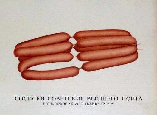 Здесь лежали пресловутые «сто сортов» колбасы, сосисок, мясных изделий, начиная от знаменитой «докторской» колбасы, действительно разработанной по рекомендации врачей для «больных, имеющих подорванное здоровье в результате Гражданской войны и царского деспотизма», до различных сырокопченых изделий разного вида.