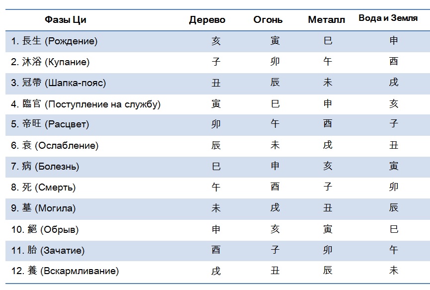 Так как стихии не имеют в природе разделения на полярности (в одном столпе в НС и ЗВ могут быть разные по полярности элементы), то фазы Ци пяти элементов стихий в На Инь смотрятся, только как Янские (не забывайте, что это не материя, это высшее и тонкое проявление Ци). Причем Вода и Земля смотрятся через фазы Янской Воды 壬, Металл – через фазы Янского Металла 庚, Огонь – через фазы Янского Огня 丙, а Дерево – через фазы Янского Дерева 甲.