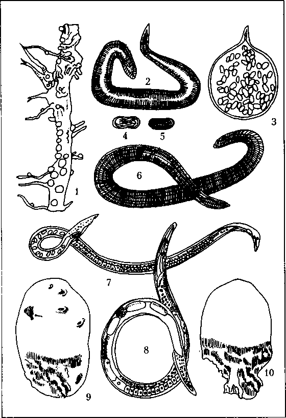 Нематоды картофеля. Картофельная нематода: 1 – часть корня картофеля, сильно пораженного нематодой; 2 – личинка; 3 — самка; 4 и 5 – яйца; 6 – самец. Стеблевая нематода картофеля: 7 – самец; 8 – самка; 9 – клубень, сильно пораженный нематодой; 10 – пораженный клубень в продольном разрезе