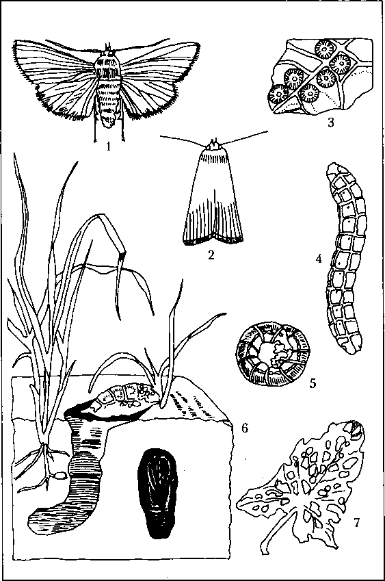 Озимая совка:1 и 2 – бабочки; 3 – яйца на листе; 4 и 5 – гусеницы; 6 – гусеница, повреждающая всходы озимых, и куколка в почве; 7 – поврежденный лист вьюнка