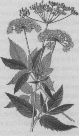 Прямой, слабо разветвленный на верхушке стебель высотой 50-100 см имеет листья чистого зеленого цвета, снизу опушенные, сверху гладкие, разделенные на три доли. Каждая из них сидит на своем коротком черешке и, в свою очередь, разделена на 2-3 листочка с мелко зазубренными краями. В ботанике такие листья называют двоякотройчатыми.