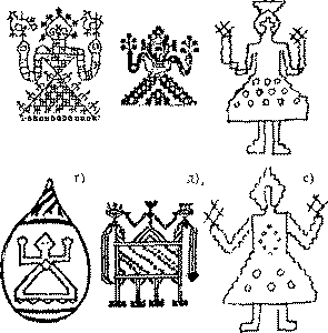 Следы былой близости выявляются и в других традициях, прослеживаемых в материалах и духовной культуре. Неоднократно уже публиковались данные о сходстве мотивов вышивки, издревле повторяемых при изготовлении носильных вещей, и орнаментов, встречающихся в ювелирных украшениях, в резном деревянном убранстве домов, в росписи посуды и т. п. Эти мотивы не случайны – им приписывалось магическо-заклинательное значение, они посвящались природным явлениям, служили знаковыми системами для общения с силами, неподвластными воле человека, и играли роль оберегов от неблагоприятных воздействий на дела, здоровье и жизнь.