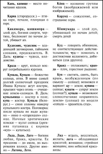 В завершение этих сопоставлений, необходимость углубления и продления которых давно назрела, вспомним еще лишь один пример. Мы знаем, что капищем назывались у славян места поклонения идолам, а вот как назывался сам идол – не знаем. Заглянув в санскритские словари, встретим там слово «капа», означающее «группу богов». Нам думается, что напрашивающееся сравнение даже не потребует глубокого аналитического разбора и разъяснения.