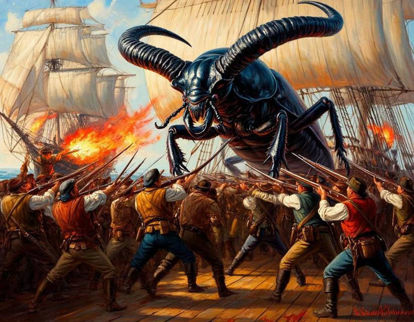 Я снова поднёс подзорную трубу к глазу, внимательно осматривая вражеский корабль. Стало ясно, что у них отсутствуют дальнобойные орудия. Вместо пушек вдоль бортов выстроились какие-то странные пульсирующие мешки, покрытые жилистой плотью. Но главную угрозу представляли жвала. Массивные челюсти, явно способные раскрошить корпус нашего судна одним укусом.