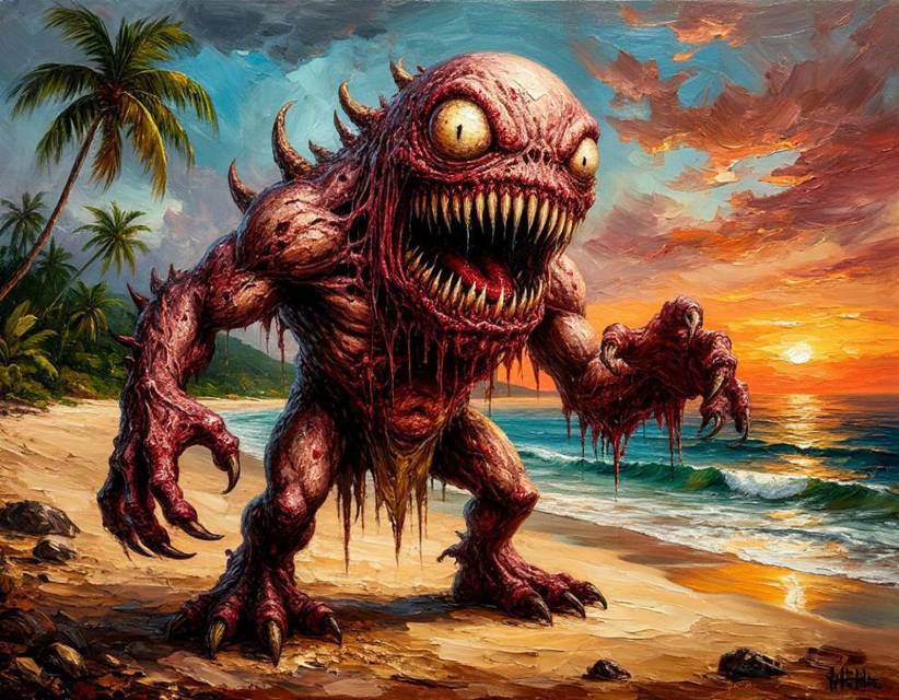 Покрытое тёмно-алой плотью с гниющими трещинами и свисающими клочьями разложившихся волокон, существо неспешно ступало по песку. Огромные глаза вращались в черепе независимо друг от друга, выискивая нарушителей. Один метался по кораблю, другой сканировал джунгли. В них не было ни капли разума – только голод и жажда убийства.