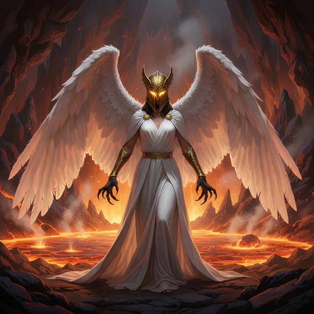От Серафиды исходил жар, но не обжигающий, а обволакивающий. Он напоминал прикосновение материнских рук или потрескивание очага в зимнюю ночь. Даровал чувство спокойствия и защищённости. Изысканная белая мантия ниспадала мягкими складками. Шлем скрывал черты лица, оставляя видимыми только глаза, которые горели божественным светом.