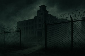Наш бег завершился у подножия сооружения, которое, казалось, было воплощением отчаяния. Казарма представляла собой громадный, продолговатый бункер из темного, проржавевшего металла, по которому струились тёмные подтеки. Никаких окон, лишь щелевидные отверстия под самой крышей, похожие на прищуренные глаза. Массивная дверь из стальных листов стояла приоткрытой, и из её темного проема тянуло запахом плесени и окисленного железа.