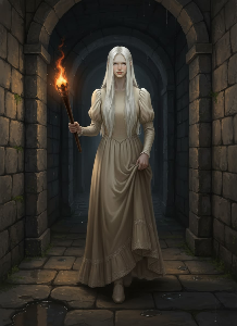 Дверь – тяжёлая, каменная, которую я раньше не замечала, – бесшумно распахнулась. В проёме возникла девушка. Она была одета в простое платье бежевого цвета, закрывавшее её с шеи до самых пят. Её волосы, белые, как первый снег, ниспадали прямым водопадом. Но больше всего поражали глаза – бледные, почти прозрачные, они сливались с белками, делая взгляд призрачным и неприятным. Словно глаза мертвеца.