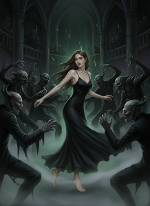 Вокруг меня закружился безумный,адский хоровод. Существа с когтями вместо пальцев, с множеством глаз, с различными телами, – все они мелькали в призрачном свете, их движения были резкими, порывистыми, лишёнными человеческой логики. Я попыталась вырваться, метнуться к стене, но меня тут же мягко, неотвратимо отбрасывало обратно в водоворот. Они не причиняли физической боли – лишь кружили, толкали, дразнили. Их шипение, щелчки и гортанный смех сливались с музыкой в одну издевательскую симфонию.
