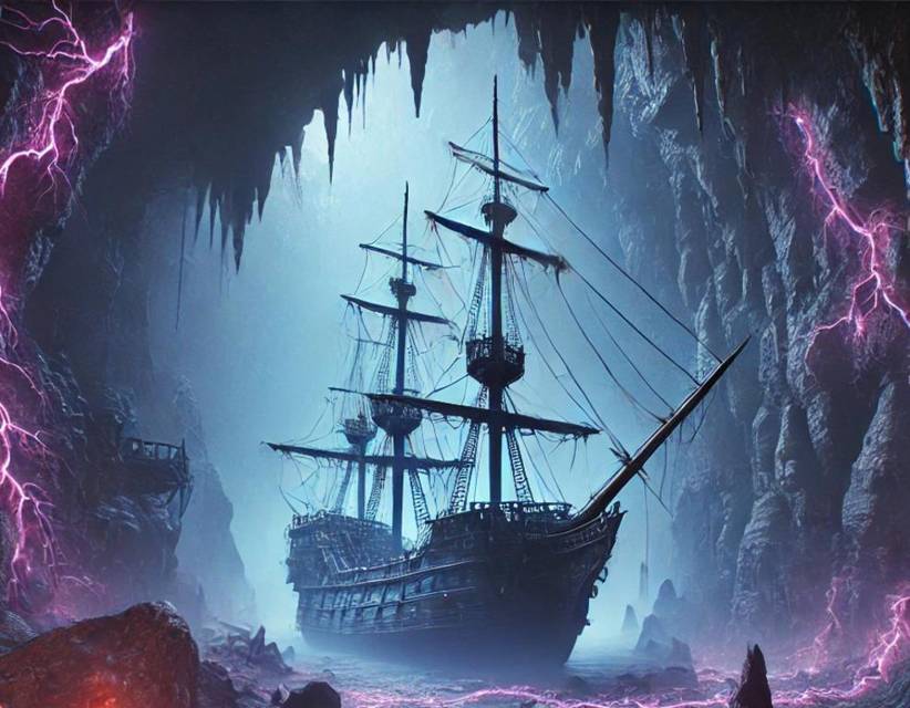 Посреди грота на мели сидел огромный боевой фрегат, будто случайно провалившийся сквозь земную кору. В паре сотен метров над кораблём отчётливо виднелось яркое небо.