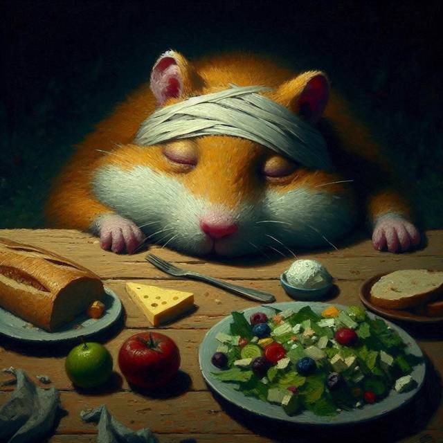 Жека сдался первым. Его сознание отключилось, вероятно, ещё четверть часа назад, но никто этого не заметил в пьяном угаре. Морда молодого грызлинга покоилась прямо возле тарелки с остатками листьев салата, которые так пришлись ему по вкусу.