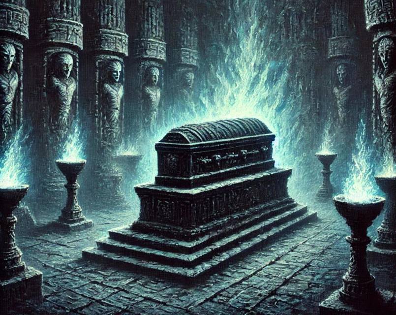 Коридор расширялся, переходя в прямоугольное помещение, напоминающее склеп без выходов. В центре возвышался массивный саркофаг, испещренный резными символами и глубокими трещинами. По периметру зала тянулись тяжелые колонны, в камне которых были высечены силуэты древних героев. В стенах темнели ниши, забитые разным хламом.