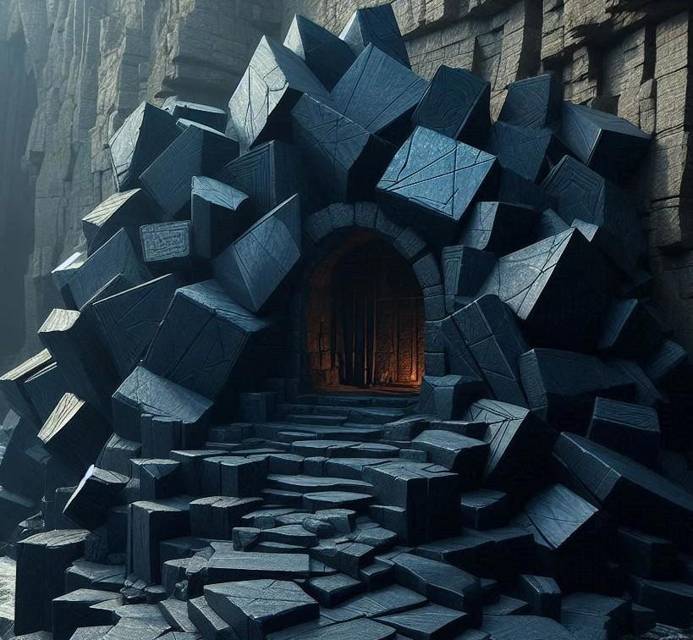 На половине пути встретил новое подземелье. Вход выглядел как расколотый монолит с причудливыми изломами. Грубые чёрные каменные блоки кубической формы беспорядочно громоздились друг на друга. Узкий проход, скрытый в тени квадратных глыб, тянулся внутрь, освещённый лишь тусклым медным светом факелов.