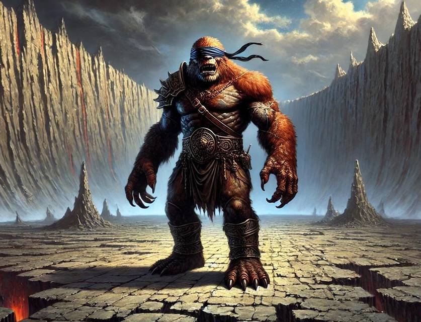 Глаза его были перевязаны чёрной повязкой, длинные концы которой развевались на ветру, как флаг. Казалось, этот гигант не нуждался в зрении, чтобы ощущать мир вокруг и точно знать, кто станет его следующей жертвой. Каждое движение чудовища излучало необузданную силу. Пальцы с огромными когтями сжимались в кулаки, широкая грудь вздымалась, а в позе читалась готовность к бою.