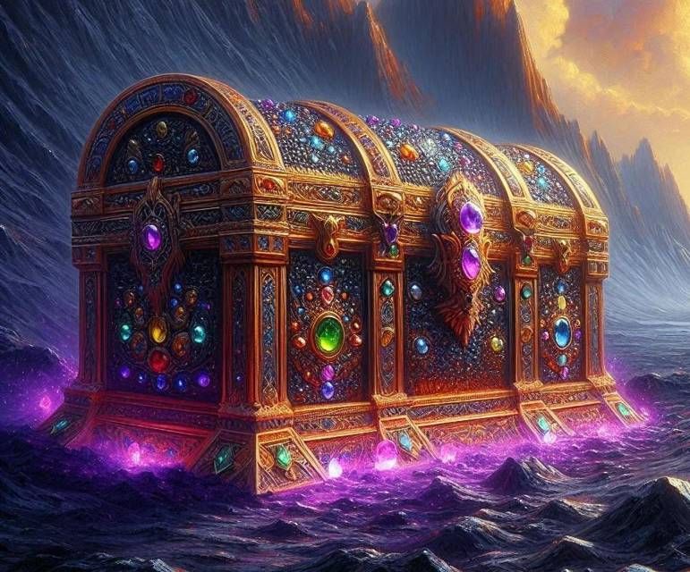 Массивный корпус был выкован из тёмного металла, оплетённого изящными узорами из чистого золота. Крупные сверкающие камни украшали каждую грань. Изумруды, сапфиры, рубины и аметисты были инкрустированы по всей поверхности чудо-сундука, который окутывала лёгкая фиолетовая аура. Неведомые символы на рёбрах, искры, вспыхивающие в переливах камней, да и вообще каждая деталь намекала на невероятную ценность содержимого.