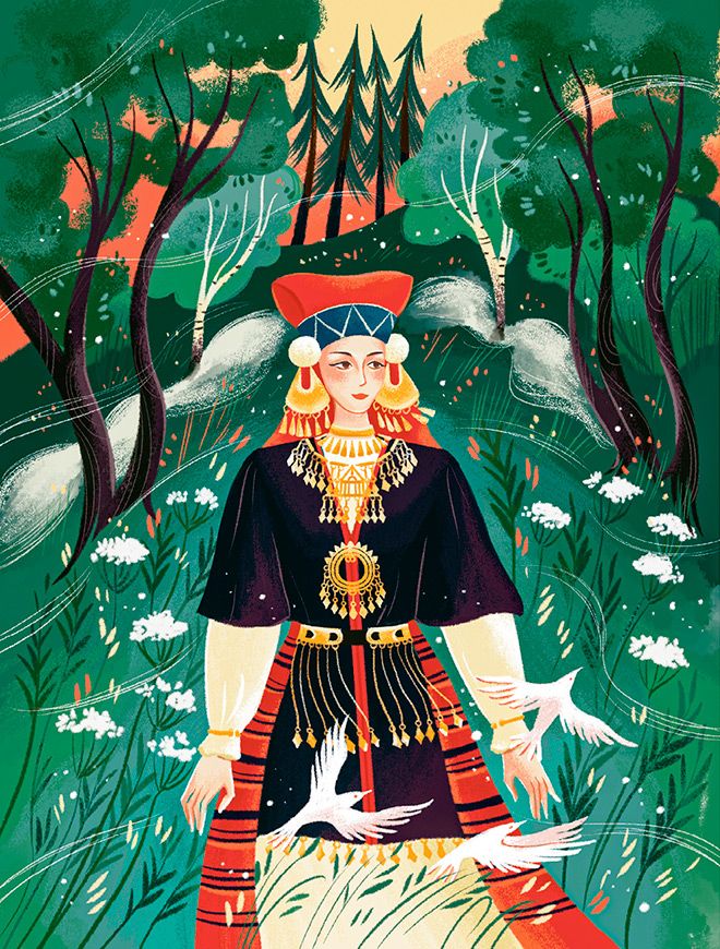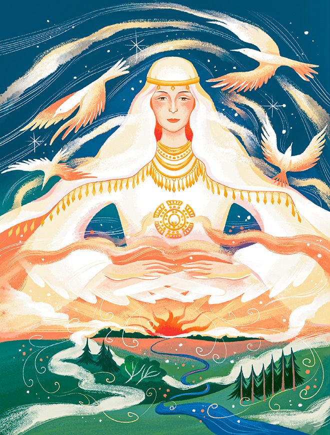 Как звали древнюю богиню? В старинных мещерских заговорах, а иногда и в сказаниях она упоминается как Мати Ангея или Ангия. Это созвучно с именем языческой богини-матери у мордвы – Анге Патяй. Она считалась матерью всех богов и покровительствовала всему живому на земле. В ее небесном тереме хранились души нерожденных детей и семена еще не проросших растений. В летающих по осени паутинках люди видели нити судьбы, сотканные Анге Патяй. Она охраняла рожениц и встречала новорожденных, приходящих в этот мир. Ее любимое дерево – береза, священная у мордвы.