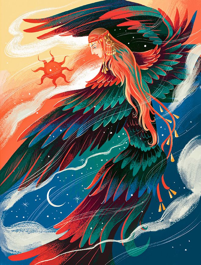 Божья Матушка, увидев это, сказала: «Зачем ты доверил следить за порядком этим попрыгушкам? Они как малые дети. Разве ты не знаешь, что для поддержания порядка в мире нужна женщина?» Тогда Бог создал полуптицу-полудеву и назвал Заряной. Голова у Заряны – красивой девицы, а тело – птичье, крылатое, покрытое огненными перьями. Создал Бог ее и повелел следить, чтобы не смешивались свет и тень, день и ночь. С тех пор облетает Заряна землю утром и вечером. Утром будит Солнышко красное, вечером спать его укладывает и Месяц ясный будит. Трудная у нее работа, ответственная. Да еще все постоянно отвлекают: то девки бедовые зовут помочь, приворожить парня («Заря-Заряна над землей летала, ключи собирала…»), то лекарки со своими молитовками обращаются.