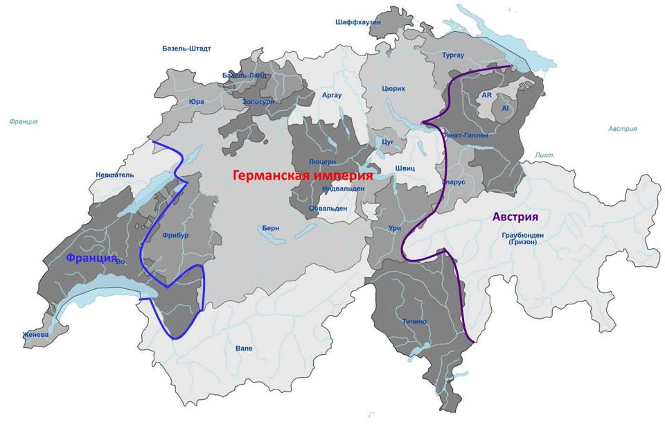 С Самого начала мы обозначили свою позицию, что пять мятежных кантонов однозначно просились под руку Рейха и только нам и достанутся. Это Унтревальден, Тичино, Ури, Вале и Тургау. Больше всего обломились те же макаронники, ибо они претендовали на италоязычный Тичино (именно по причине лояльного населения) и южную часть Граубюндена, но тут вам не там – обломилось и даже самая последняя малость. Виктор Эммануил надулся, как сельский индюк, при гневной речи его усы подобно пикам угрожали пронзить небо… но весь королевский пыл ушел в никуда. Тьер цыкнул на раздухарившегося сардинца и тот примолк и до конца конференции не отсвечивал. Вообще на Вале или его кусок галлы сами замахнулись, их претензии были ОГОГО какими большими! Но… получили максимум из того минимума, что мы могли им предложить: кантоны Невшатель, Во и Женева. Ну, и в качестве небольшой компенсации маленький кусочек Фрайбурга (в районе чуть западнее Муртенского озера. Вообще-то Тьер хотел полностью отжать и Фрайбург, но вот так, как получилось, так и получилось. Пусть и этим будет доволен.