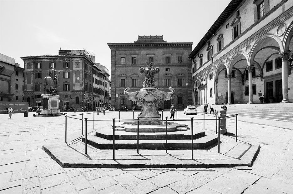 Данный проект Брунеллески был связан с поисками решения основной задачи – проблемы организации пространства. Здание занимает одну сторону площади. Его фасад равно принадлежит и зданию, и площади, имея своим назначением обеспечить переход от открытого пространства площади к пространству интерьера. При взгляде на него на память приходят античные, окруженные колоннадами площади.