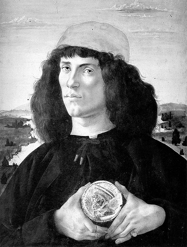 Сандро Боттичелли, «Портрет неизвестного с медалью», дерево, темпера, 57,5×44, около 1474. Флоренция, Галерея Уффици.