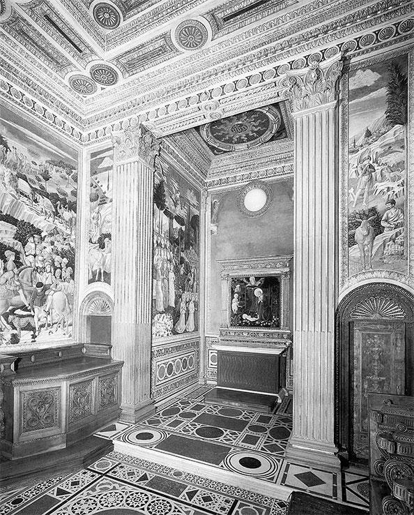 Еще при жизни Козимо по заказу Пьеро в 1459–1460 годах Беноццо Гоццоли расписал капеллу в палаццо Медичи на сюжет «Шествие волхвов», в образе которых изображены члены семьи Медичи и многие их современники. Роспись покрывает все стены сплошным ковром, ввиду того, что задумывалась она не как цикл фресок, а как единая декорация, непрерывно развертывающаяся по стенам капеллы. Смысловой центр капеллы – алтарь, где расположен образ работы Филиппо Липпи: сцена поклонения Марии Младенцу с Иоанном Крестителем и Бернардином Сиенским – святыми патронами дома Медичи.