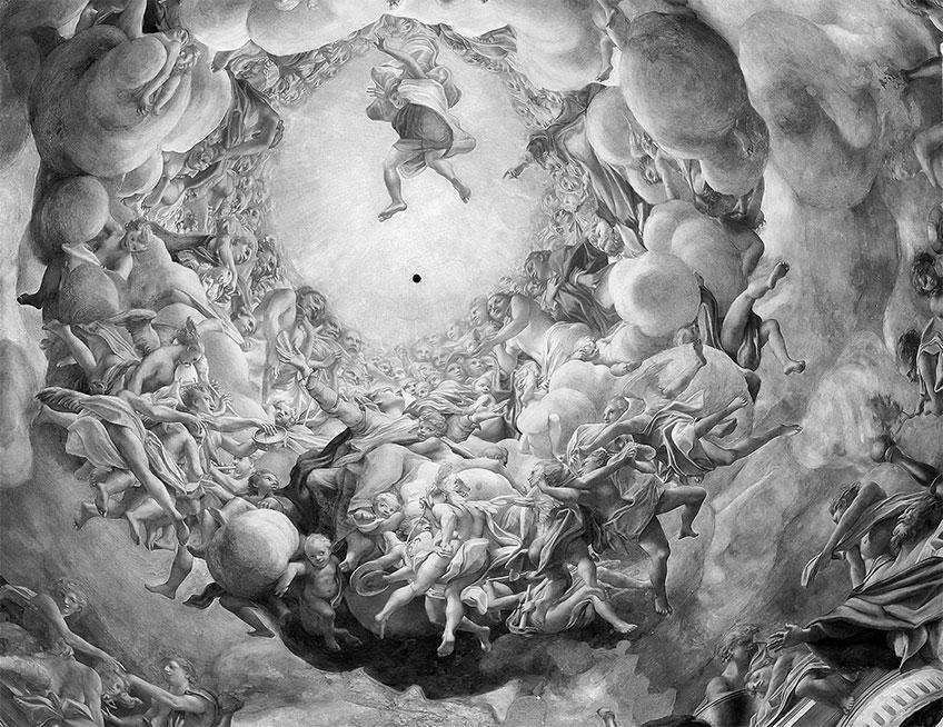 В «Вознесении Марии» – фреске, исполненной для купола Пармского собора, – Корреджо живописью создал воображаемый небосвод, задумав его как перспективное продолжение физического пространства собора, для этого художнику пришлось преобразовать всю систему изображения фигур: доведенные до возможного предела ракурсы заставляют барахтаться, тонуть, выныривать или извиваться фигуры, словно пробирающиеся вплавь среди облаков. Он усиливает также светотень, разлитую в массе фигур, для придания им материальности, не слишком отличной от ватообразной и светоносной субстанции облаков. Движимый необходимостью придать большую опору всему этому живописному построению, скрывающему архитектуру собора, он раздвинул его пределы до парусов, то есть до несущих элементов купола.