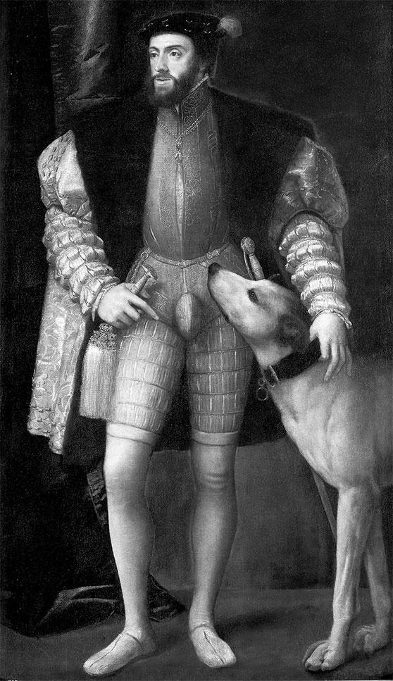 Тициан Вечеллио, «Портрет Карла V с собакой», холст, масло, 192×111, 1533. Мадрид, Прадо.