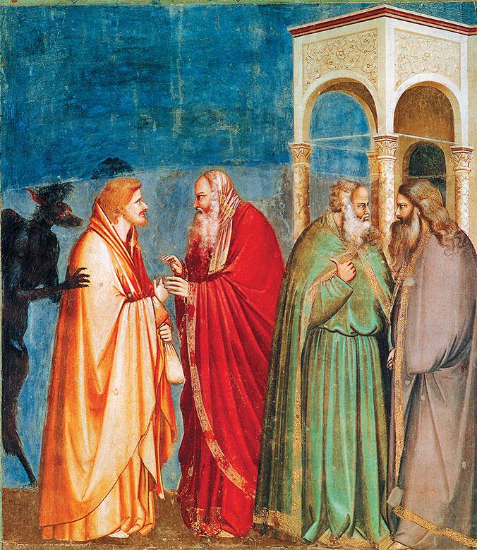 Джотто ди Бондоне, «Подкуп Иуды», 1303–1306, фреска, 150×140, Падуя, Капелла Скровеньи дель Арена