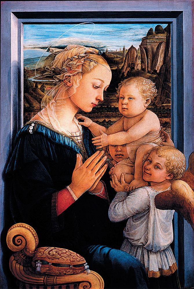 Филиппо Липпи, «Мадонна с Младенцем и двумя ангелами», дерево, темпера, 95×62, 1465. Флоренция, Галерея Уффици.