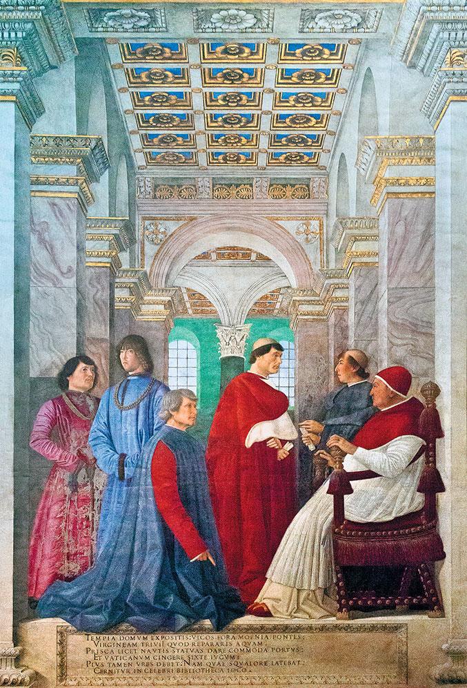Мелоццо да Форли, «Папа Сикст IV назначает Платину префектом библиотеки», фреска, 1477. Ватикан, Пинакотека